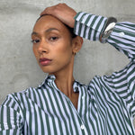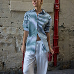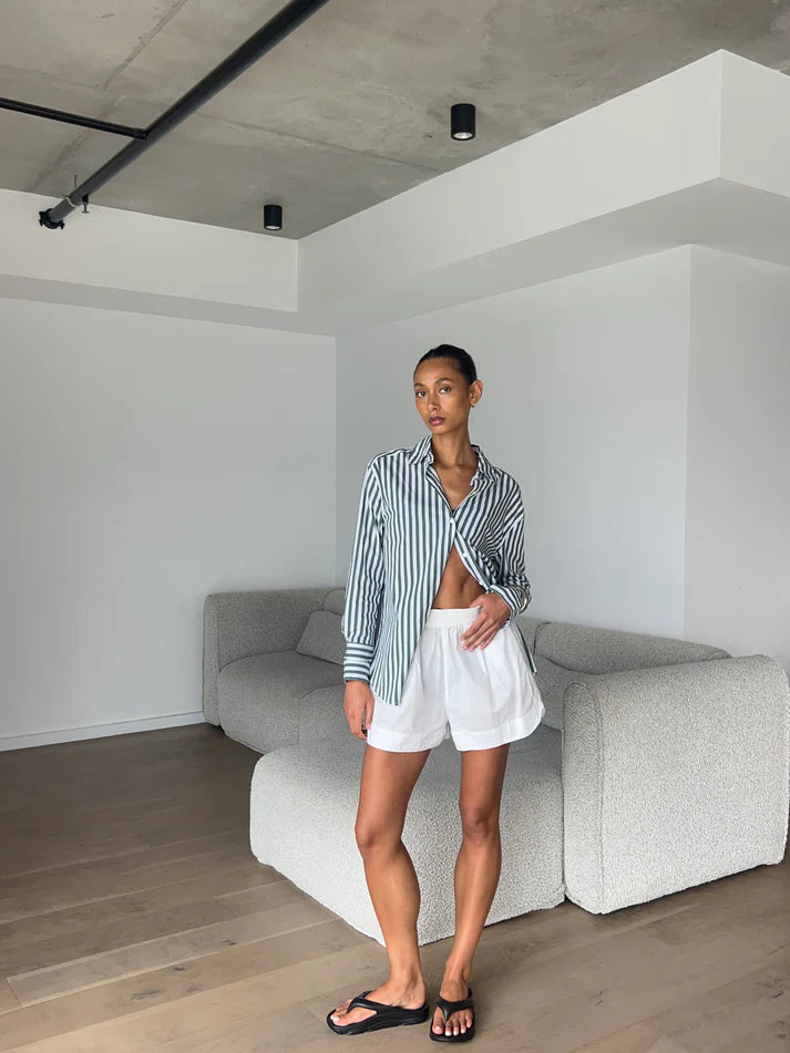 Crafted from beautiful lightweight cotton, this oversized shirt exudes effortless sophistication with its fresh washed bottle green and white stripes. Designed for a relaxed, comfortable fit,  it’s perfect for layering or wearing solo to the beach, offering both comfort and style.