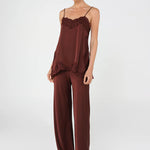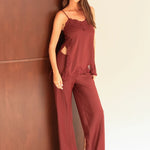 Merlot Silky feel pants with a high-waisted slim fit and internal elasticated waist for comfort. The bias-cut fabric drapes beautifully for a flattering silhouette. Perfect for effortless styling, these pants transition seamlessly from day to night with their luxe fabric and refined cut. The thoughtful waist design keeps you comfortable without compromising on that polished, put-together look. Whether you're dressing them up with heels or keeping it casual, the Mela Pant delivers understated elegance with a playful edge.